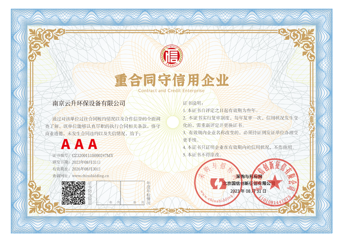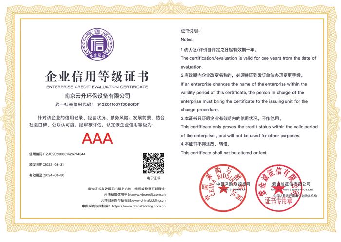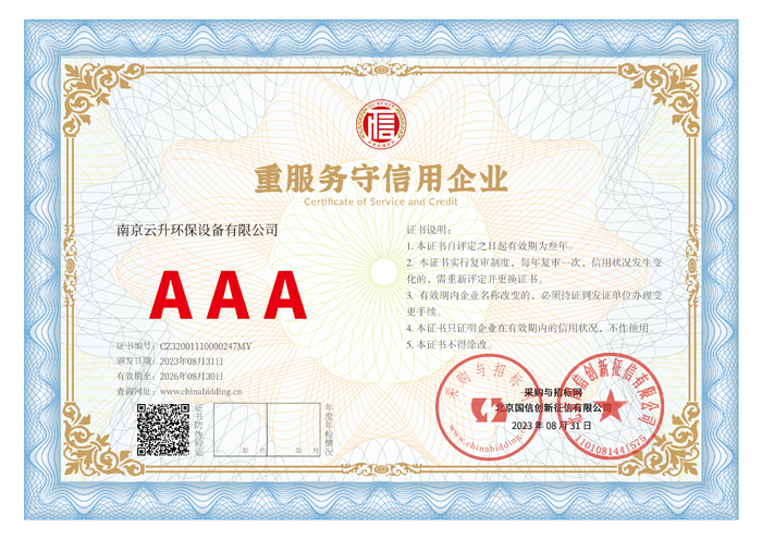 南京云升環(huán)保設(shè)備有限公司全體員工愿以環(huán)境保護(hù)為己任,以市場為導(dǎo)向,以優(yōu)質(zhì)服務(wù)為原則,嚴(yán)格的管理、先進(jìn)的生產(chǎn)工藝、至上的品質(zhì)、完善的售前售后服務(wù),與廣大新老用戶攜手并進(jìn),共鑄輝煌。公司已通過ISO9001:2000質(zhì)量管理體系標(biāo)準(zhǔn)認(rèn)證,成為江蘇省高新企業(yè),并進(jìn)行不斷的技術(shù)改進(jìn)和創(chuàng)新,為客戶和合作伙伴提供滿意的產(chǎn)品。